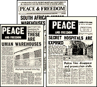 In 1976, Freedom in South Africa published a series of major reports which chronicles appalling conditions, abuse, and death for black mental patients held in white buisness-owned camps. The World Health Organization, the Red Cross, and the American Psychiatric Association conducted independent investigations which confirmed Freedoms reports. |