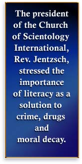 Rev. Jentzsch received the award on Mr. Hubbards behalf. In his acceptance speech, Rev. Jentzsch stressed the importance of literacy as a solution to crime, drugs and moral decay, which are the fertile ground for racism, conflict and the destruction of human rights.